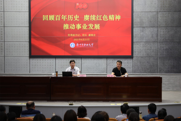 潘锦全从我们为什么要学习党史,在今年这个特殊的年份为什么如此重要引出话题,带领师生共同回顾了中国共产党百年征程的重要线索,解读了中国共产党百年历史的精神谱系,尤其是其中和高校共产党人密切相关的红船精神、井冈山精神、长征精神、“两弹一星”精神和抗疫精神。就扬州职大的共产党人而言,他从回答好实现什么样的发展?如何实现发展?以及发展依靠谁、为了谁?这三个基本问题指引广大师生员工立足自身的岗位实际,赓续红色基因,推动学校内涵建设和高质量发展。最后,潘锦全号召全校师生要奋力抢抓新一轮科技革命和产业变革浪潮下的大好机遇,奋力抢抓党和国家加快发展现代职业教育的大好机遇,奋力抢抓扬州“好地方”在“两争一前列”征程中的大好机遇。要把依靠党员领导干部、依靠一线教职员工、依靠学生群体本身、依靠社会各界支持等“四个依靠”作为学校发展的动力源泉,要把与师生共享学校改革发展的成果作为全部工作的出发点和价值旨归。