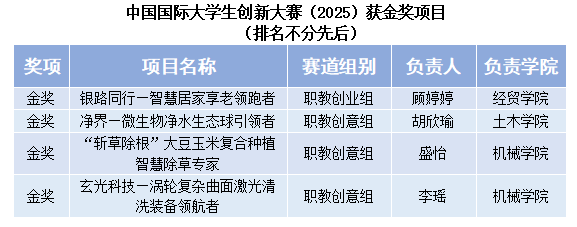 10月12-15日,中国国际大学生创新大赛(2025)总决赛在郑州大学举行。我校共有4个项目入围全国总决赛现场赛,经多轮激烈角逐,4个项目全部夺得金奖,金牌数量位居全国高职院校职教赛道首位。