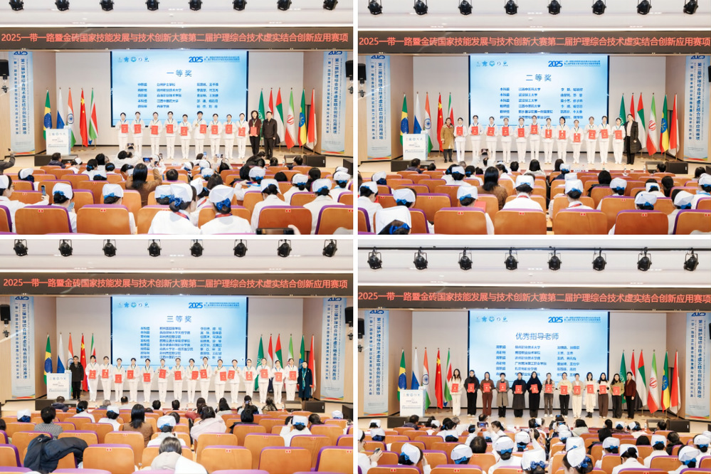 12月5日至7日,2025“一带一路”暨金砖国家技能发展与技术创新大赛第二届护理综合技术虚实结合创新应用赛项在我校高邮湖校区举办。本次大赛设立学生中职组、学生高职组、学生本科组及教师组四个赛道,吸引了来自全国20个省份的29所院校、110名参赛选手同台竞技,展现精湛技艺,弘扬护理精神。