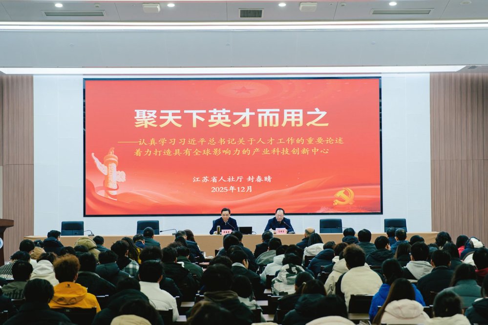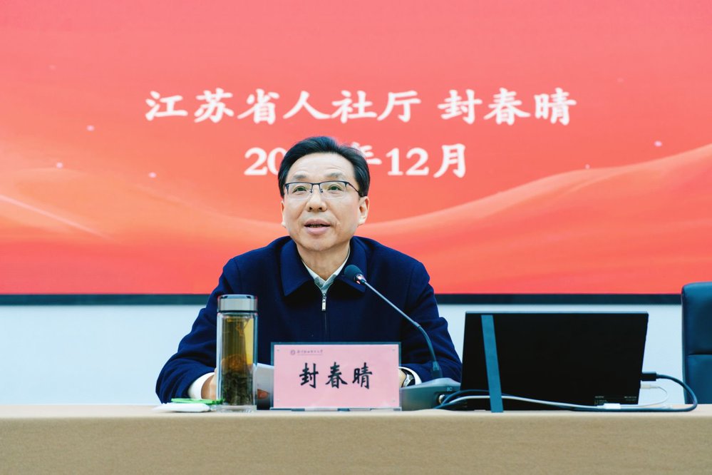 为深入学习贯彻习近平总书记关于教育的重要论述和对江苏工作重要讲话精神,落实中央及省委“进一步推动领导干部上讲台讲思政课”相关工作部署,12月15日,江苏省人力资源和社会保障厅副厅长、党组成员、机关党委书记封春晴以“聚天下英才而用之——认真学习习近平总书记关于人才工作的重要论述,着力打造具有全球影响力的产业科技创新中心”为主题,为我校师生讲授了一堂内容丰富、思想深刻的专题思政课。全体校领导、中层正职干部、相关职能部门内设机构负责人、马克思主义学院全体教师及机械、模具、商务英语等专业的学生代表到场聆听。